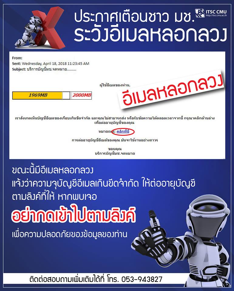 ในขณะนี้มีอีเมลหลอกลวง แจ้งว่าบัญชีอีเมลของท่านเกินขีดจำกัด ให้ทำการต่ออายุอีเมล หากท่านใดพบอีเมลลักษณะดังกล่าว อย่ากดเข้าไปตามลิงค์ !! เพื่อความปลอดภัยของข้อมูลของท่าน